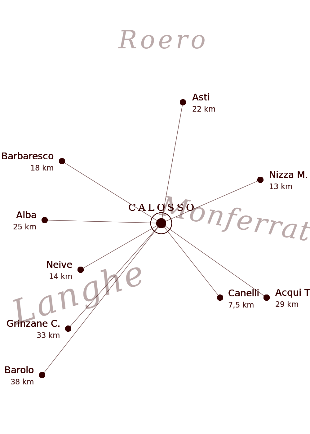 Casa di Sofia ligt in Calosso, in de provincie Asti, in een centrale positie ten opzichte van de drie grote heuvelsystemen van het zuiden van Piรซmont: Langhe, Monferrato en Roero. Een territorium erkend als Werelderfgoed van de UNESCO in 2014, vanwege de uitzonderlijke landschappelijke en culturele waarde.